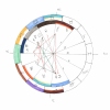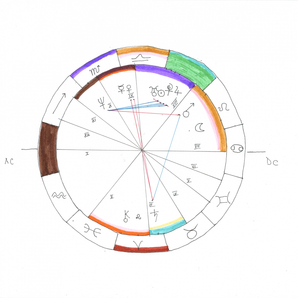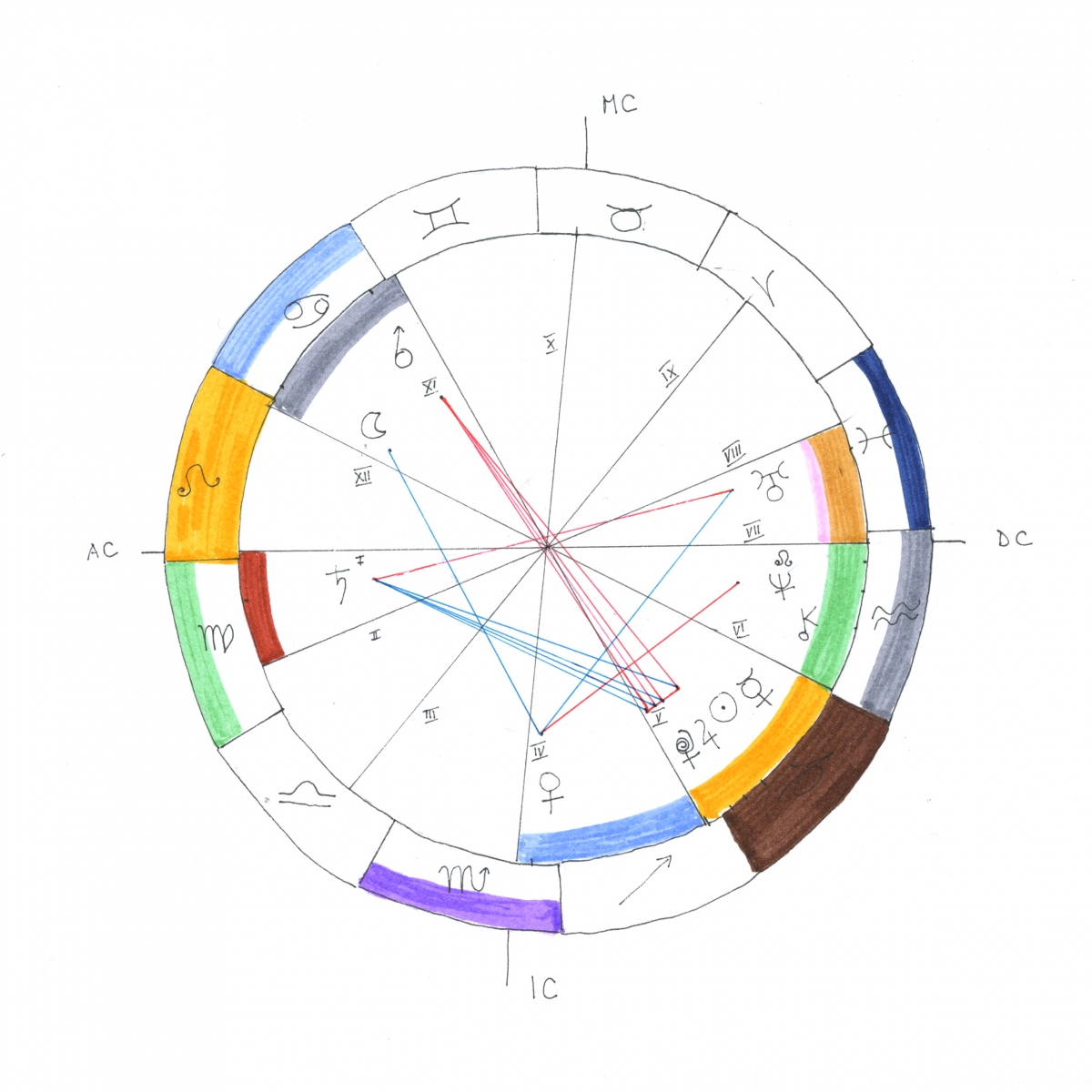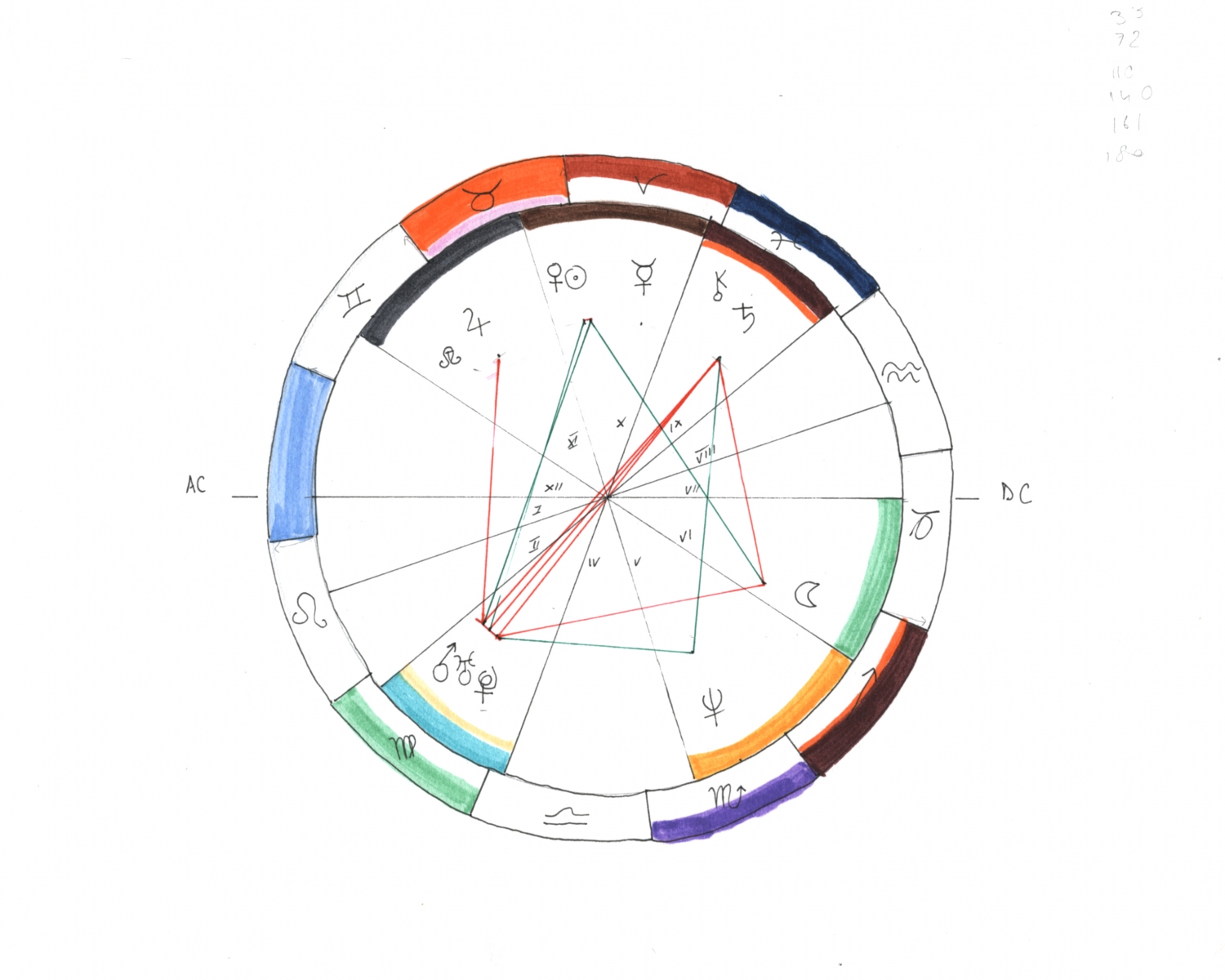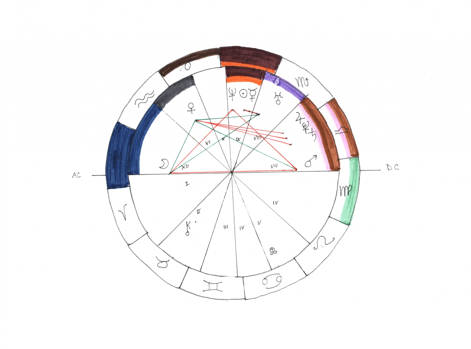 Diagrammi di temi astrologici natali ridisegnati a mano secondo un codice cromatico personale che lavora sulla ricerca e la lettura visiva di questo sistema simbolico. Sono colorati i segni le case occupate dai pianeti principali, sole luna marte mercurio giove venere saturno urano nettuno plutone (non Chirone, che pure è segnato, non gli asteroidi che non ci sono, non i nodi lunari, anche se disegnato il nodo sud) segni e case corrispondenti hanno lo stesso colore.